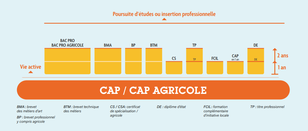 Pour les CAP proposés en lycée professionnel agricole on parlera de CAPA (certificat d’aptitude professionnel agricole).