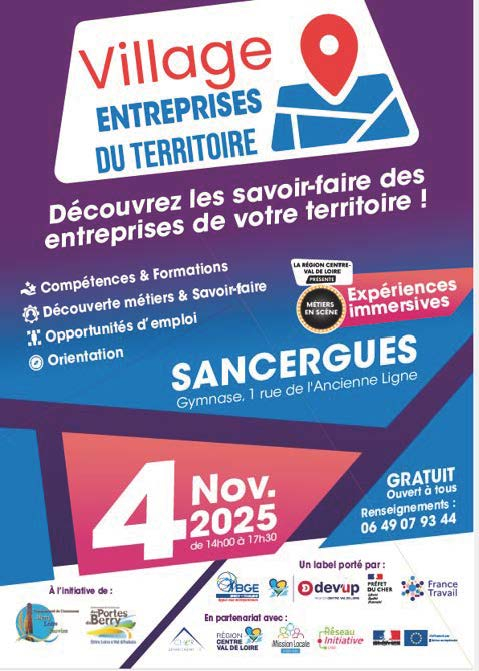 Rendez-vous au « Village Entreprises du Territoire » qui aura lieu le mardi 4 novembre de 14h à 17h30 au gymnase de Sancergues (1 rue de l'Ancienne Ligne).